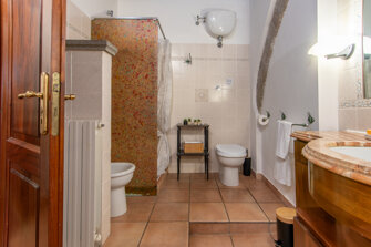 La stanza da bagno, di generose proporzioni, accoglie un lavabo con mobile, una doccia, una vasca, WC e bidet.